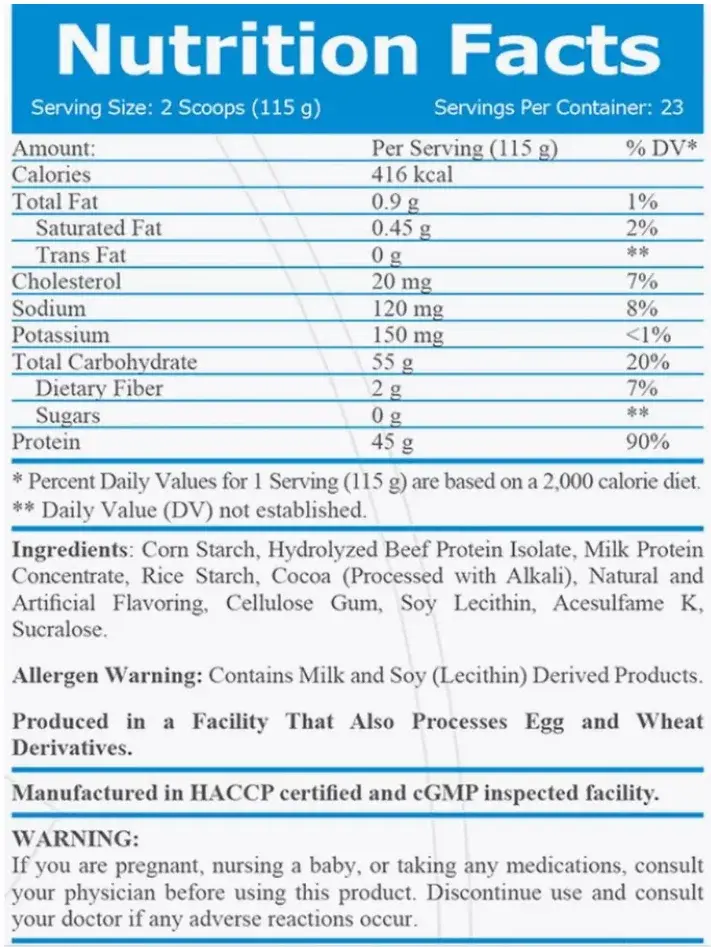 • Белки: 45 г (гидролизованный изолят говяжьего протеина)