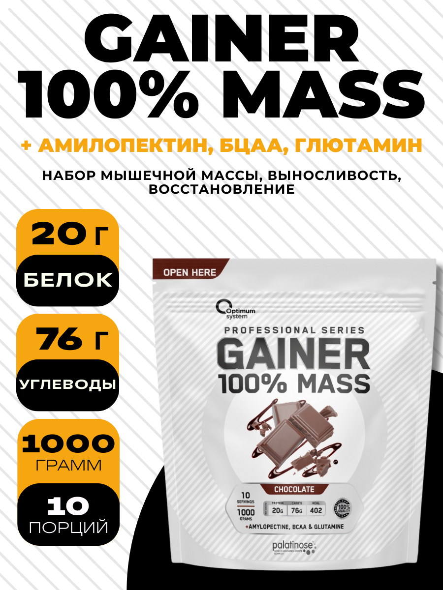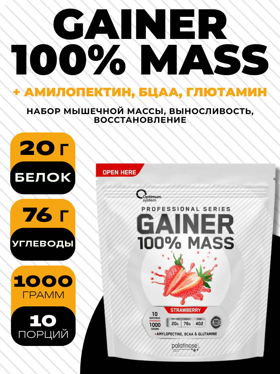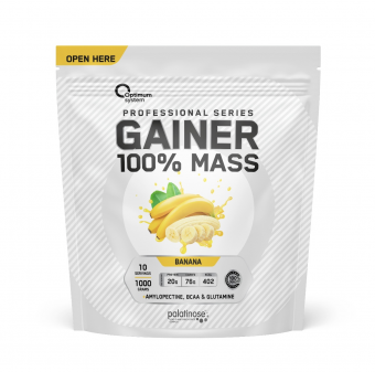 100% Mass Gainer Optimum System — надёжный помощник для тех, кто стремится к максимальному результату в наборе массы.