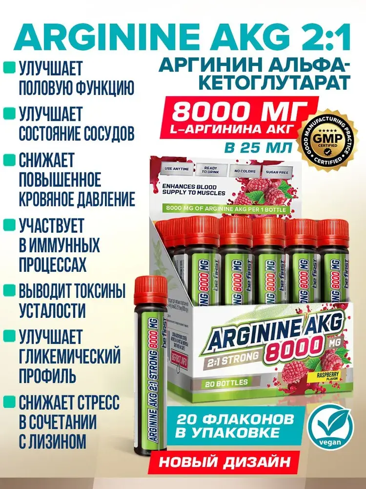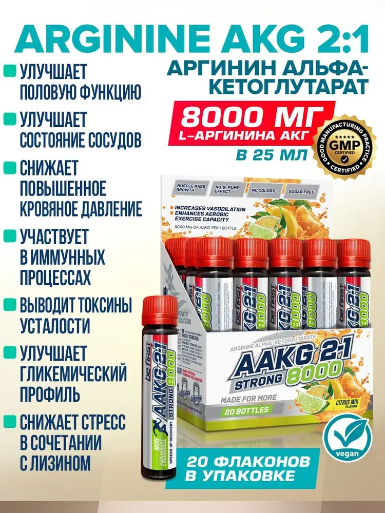AAKG 8000 Strong от Be First — это мощный предтренировочный комплекс в форме ампул для максимального пампинга и повышения выносливости. Каждая ампула 25 мл содержит 8000 мг аргинина альфа-кетоглутарата.