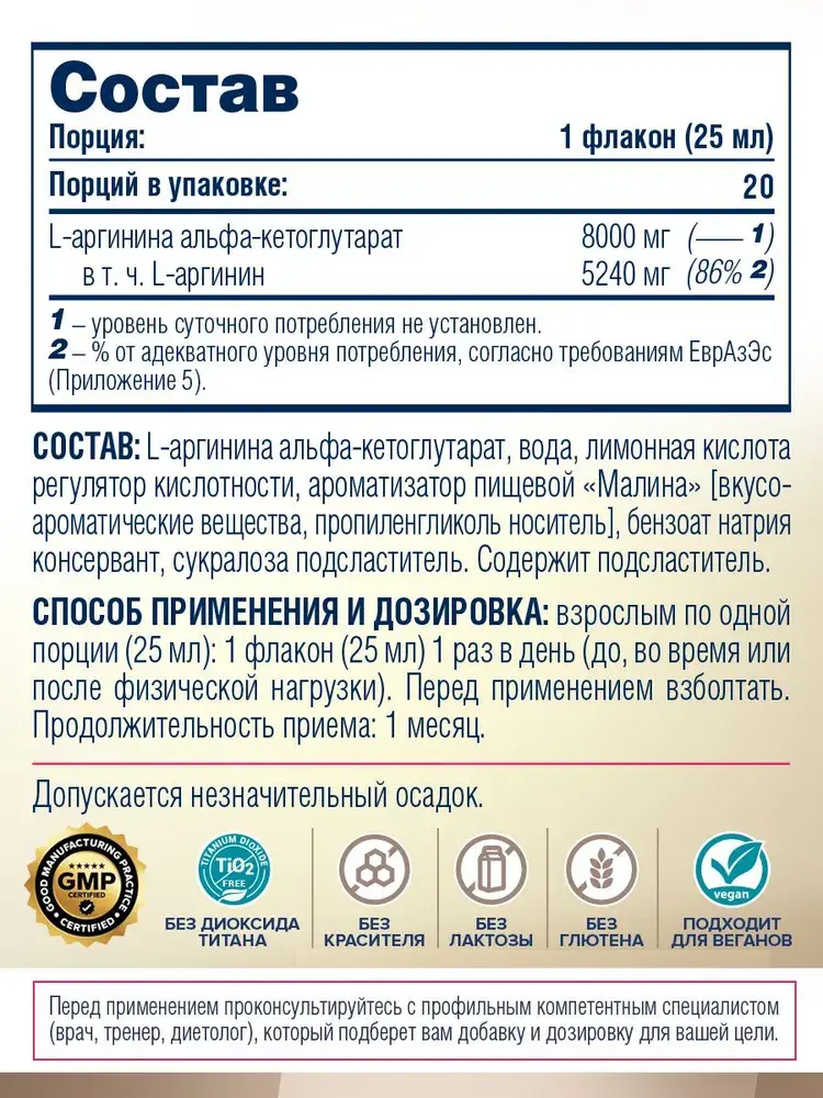• L-аргинин альфа-кетоглутарат (2:1): 8000 мг