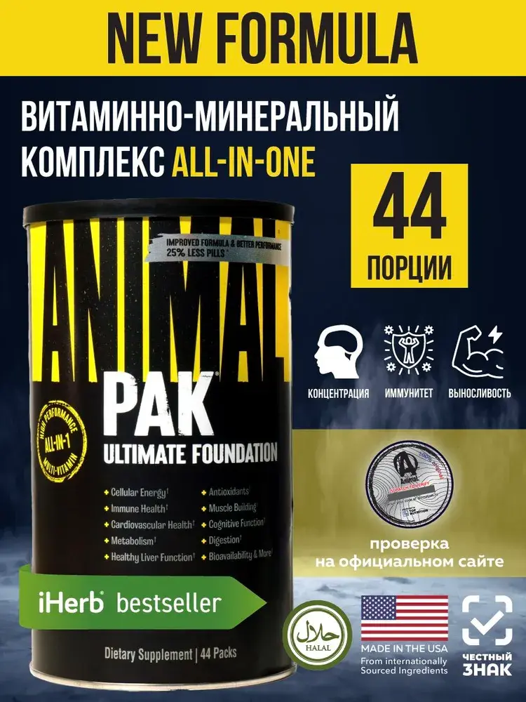 Universal Nutrition Animal Pak — культовый витаминно-минеральный комплекс, созданный специально для спортсменов, испытывающих высокие физические нагрузки. Это многокомпонентная формула, включающая витамины, минералы, аминокислоты, антиоксиданты, ферменты и энергетические компоненты.