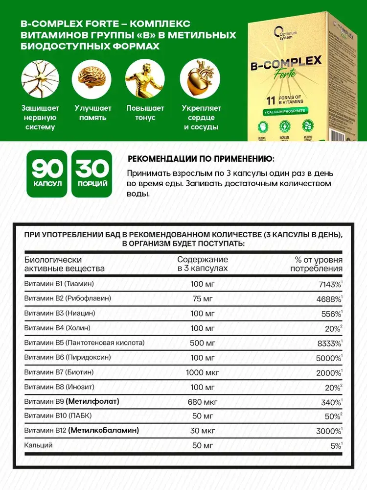 B-Complex Forte от Optimum System — это усиленная формула витаминов группы B в биологически активных формах. Упаковка содержит 90 капсул, что обеспечивает 30 полноценных порций с 11 формами витаминов, включая 30 мкг метилкобаламина (B12) и 680 мкг метилфолата (B9). Комплекс разработан для максимального усвоения и эффективности.