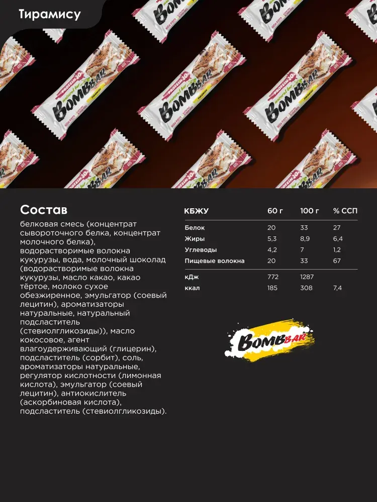 Наш самый популярный продукт — протеиновые батончики Bombbar — создан с любовью для тех, кто заботится о своем здоровье, но не готов отказываться от вкусностей. Это идеальный выбор для тех, кто предпочитает сладости, но хочет соблюдать ПП. Наши батончики обогащены протеином (концентрат сывороточного белка) и натуральными компонентами (орехи, ягоды, шоколад без сахара), и не содержат сахара и вредных добавок. В них много белка и клетчатки, и минимум жиров и углеводов. Их заслуженно можно считать оптимальным вариантом для набора массы и восполнения дефицита белка в рационе.