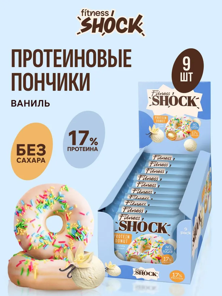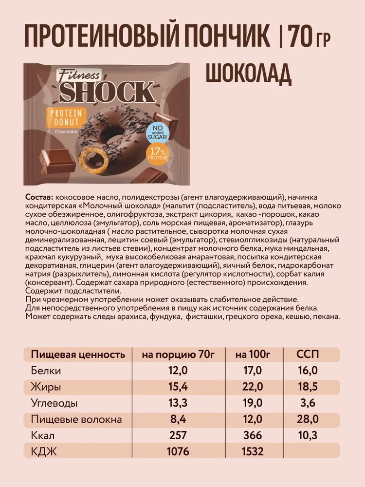 Батончик - Donut FitnesShock — это протеиновый батончик в форме пончика, который сочетает в себе удовольствие от любимого десерта с пользой функционального питания. Уникальная форма и нежная текстура созданы для тех, кто отказывается выбирать между вкусом и результатом.
