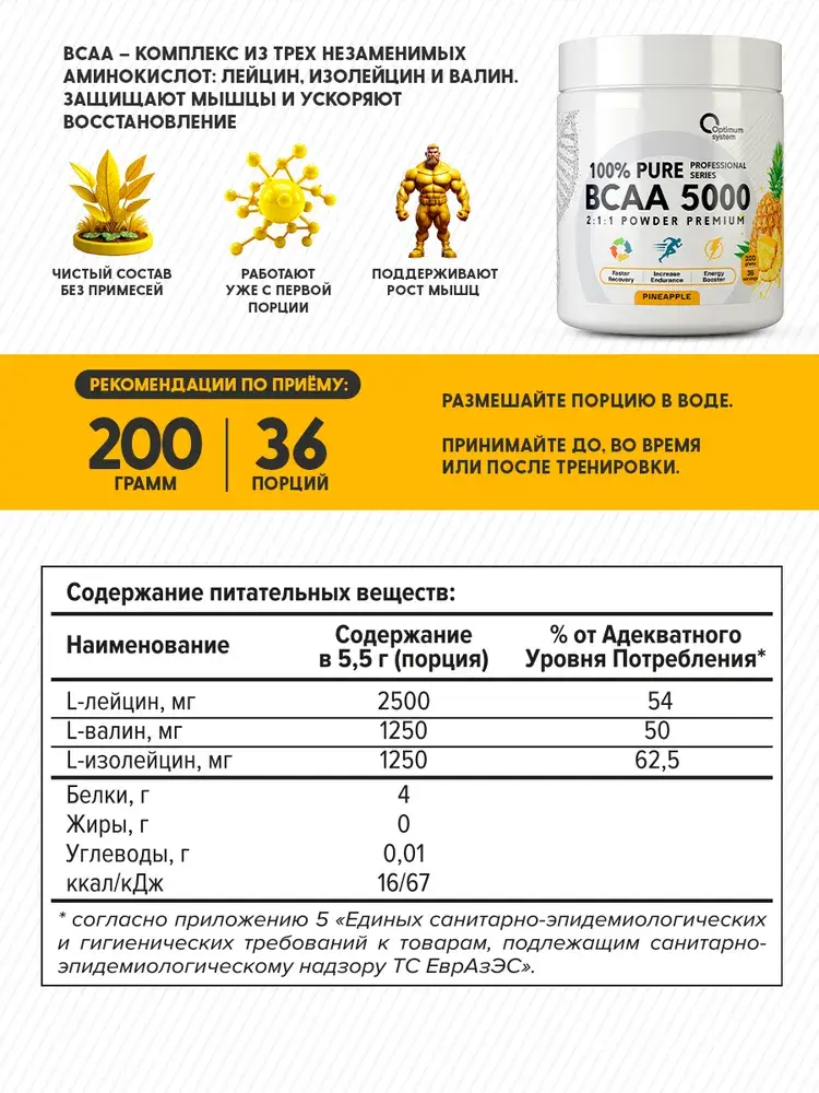 BCAA 5000 Powder от Optimum System — это высококонцентрированный порошковый комплекс аминокислот с разветвленной цепью в оптимальном соотношении 2:1:1. Упаковка 200 г содержит 36 порций по 5000 мг чистых BCAA.