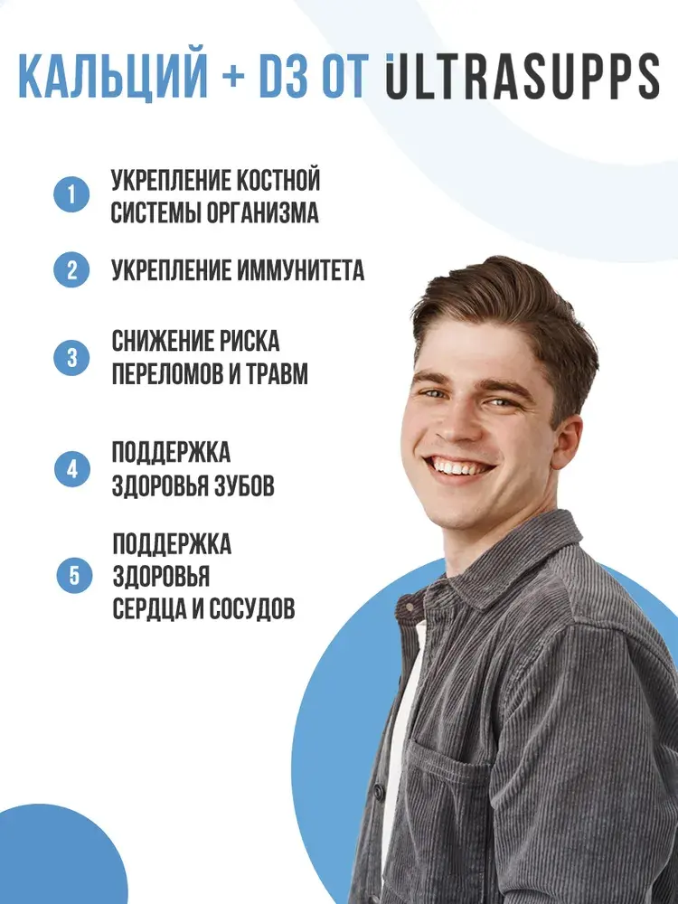 Calcium & Vitamin D3 от UltraSupps — это сбалансированный витаминно-минеральный комплекс, разработанный для поддержания здоровья костей, зубов, мышц и сердечно-сосудистой системы. Витамин D3 способствует усвоению кальция, обеспечивая его транспорт в кости и предотвращая отложение в сосудах.