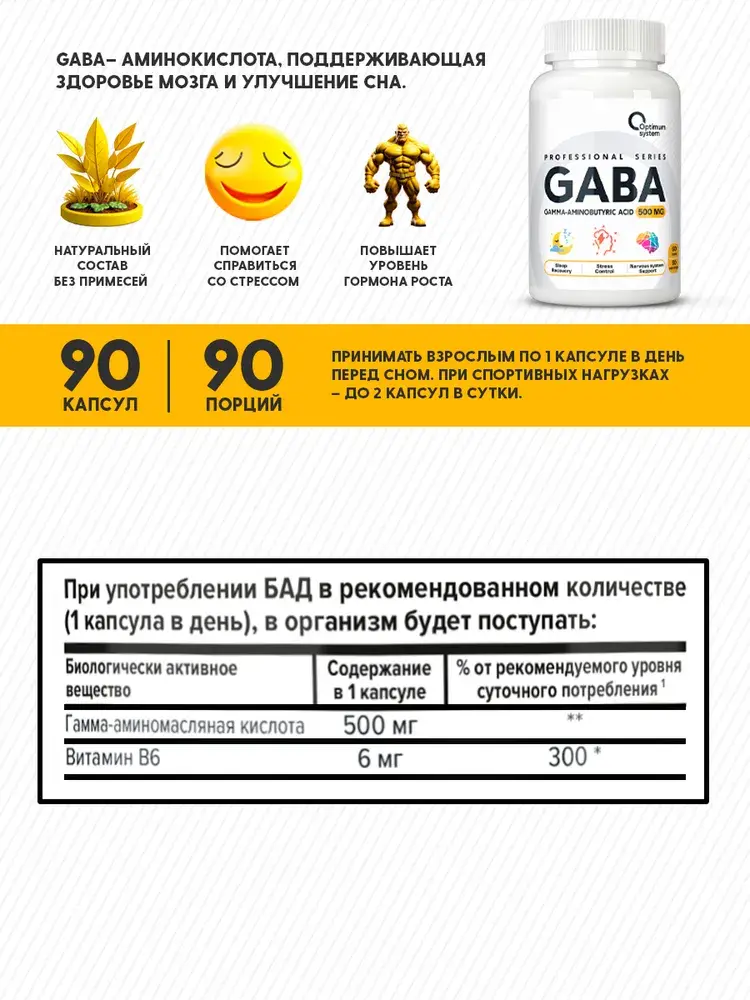 GABA 500 mg от Optimum System — это высококонцентрированная добавка гамма-аминомасляной кислоты в удобной капсульной форме. Упаковка содержит 90 капсул, что обеспечивает 90 полноценных порций по 500 мг чистого габа. Формула разработана для естественного расслабления, улучшения качества сна и снижения нервного напряжения.