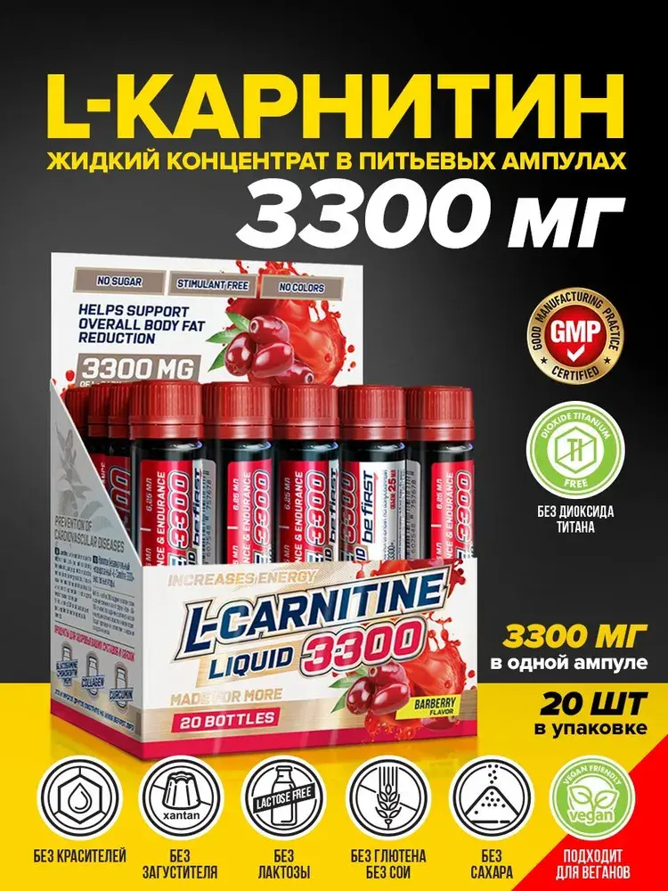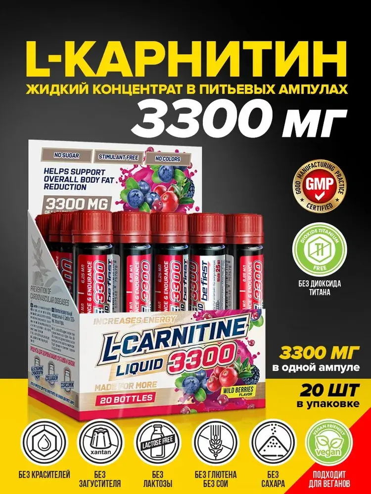 L-Carnitine 3300 мг от Be First — это концентрированный жидкий L-карнитин в ампулах для эффективного жиросжигания и повышения энергетического потенциала. Каждая ампула содержит 3300 мг чистого L-карнитина. В упаковке 25 ампул.