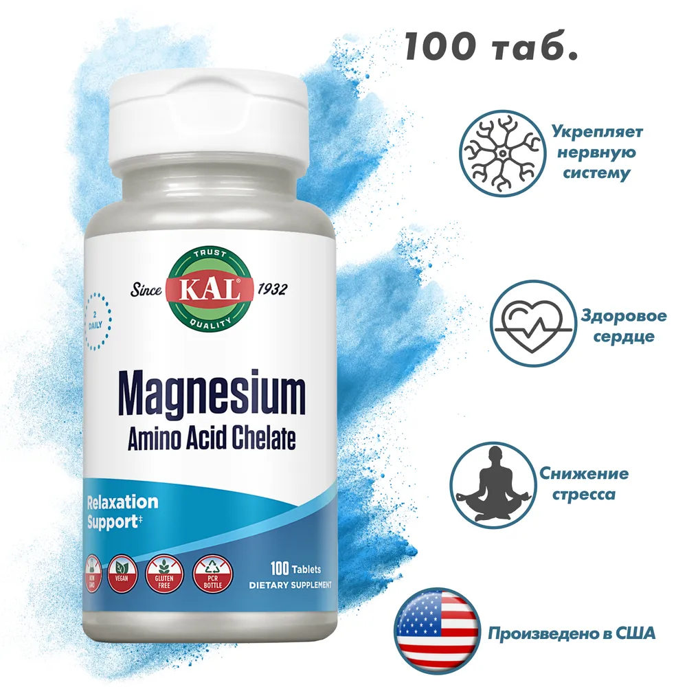 Magnesium Amino Acid Chelate KAL — это высокоусвояемый хелатный магний в форме аминокислотного хелата (глицината), разработанный для максимальной биодоступности и минимизации дискомфорта со стороны ЖКТ. Упаковка обеспечивает удобный курс для эффективного восполнения дефицита магния, поддержки нервной системы, мышечной функции и энергетического обмена.