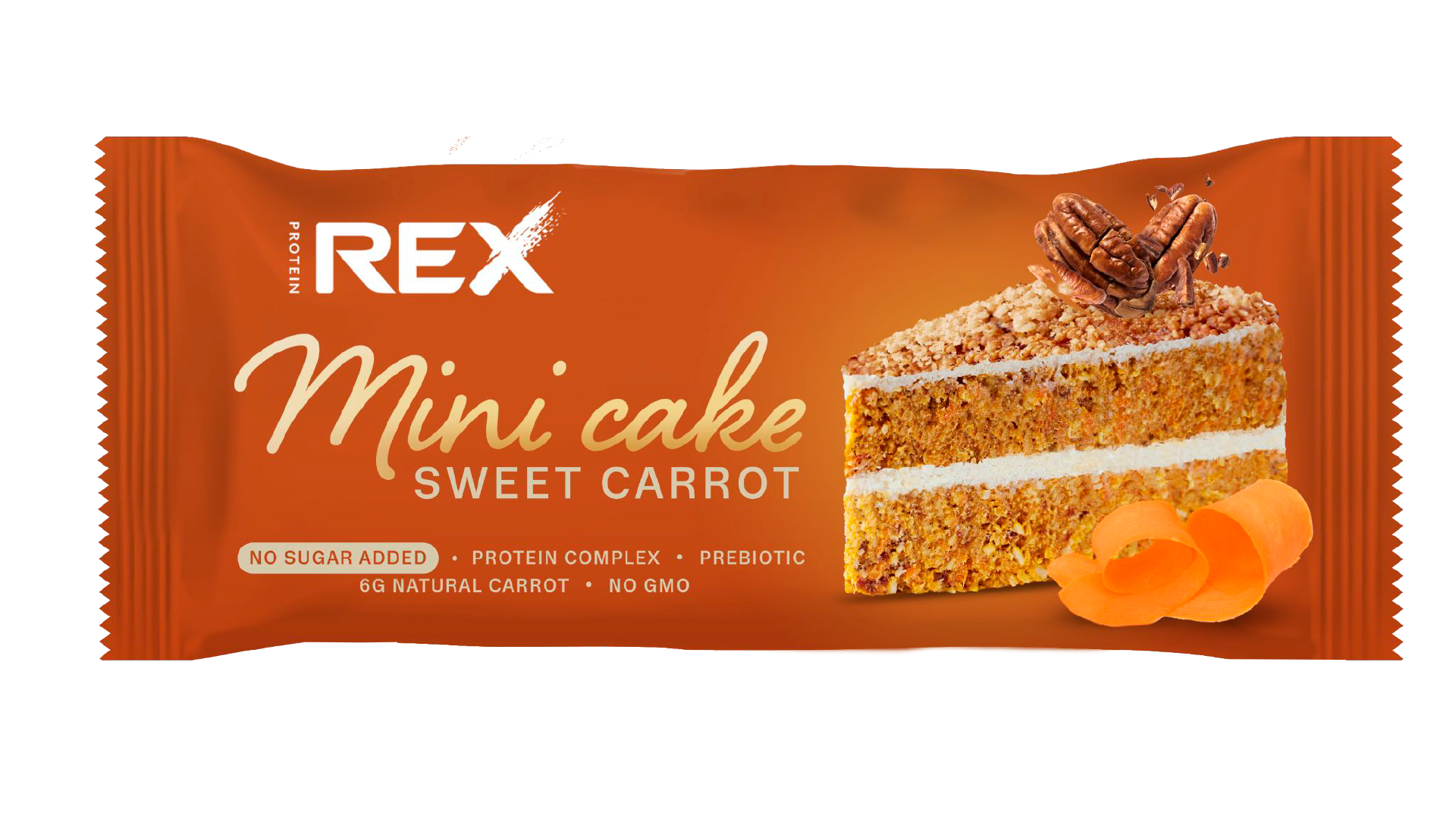 Mini Cake - Морковный тортик ProteinRex — это готовое протеиновое пирожное без добавленного сахара, приготовленное с добавлением натуральной моркови, пряностей (корица, мускатный орех, кардамон) и кусочков пекана. Каждое пирожное содержит сбалансированное количество белков, жиров и углеводов, обогащено пребиотиками и не содержит сахара, что делает его отличным выбором для спортсменов и всех, кто следит за своим рационом. Нежный бисквит с пряным вкусом позволяет насладиться десертом без чувства вины.