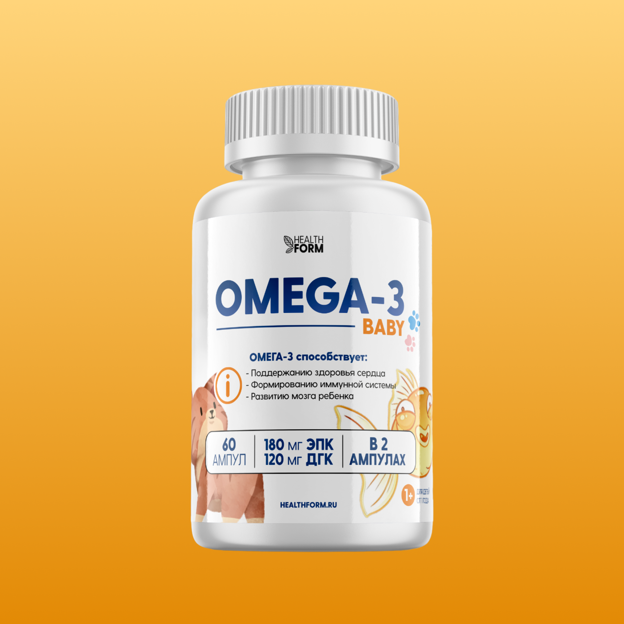 OMEGA-3 BABY (1+) Health Form — это специально разработанная добавка с омега-3 кислотами в форме рыбьего жира, предназначенная для поддержки здорового развития и иммунитета детей от 1 года. Упаковка содержит оптимальную дозировку легкоусвояемых жирных кислот EPA и DHA в удобной для малышей форме. Это забота о фундаменте здоровья ребенка с первых лет жизни.