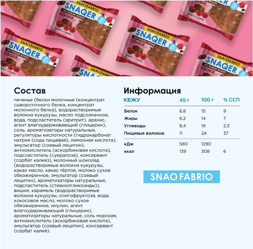 Печенье SNAQER от бренда Snaq Fabriq – идеальный перекус в любой ситуации! Высокое содержание пищевых волокон способствует насыщению надолго, обеспечивая энергией для продуктивного дня. Удобная упаковка по 45 грамм позволяет всегда иметь под рукой вкусное и полезное лакомство, которое легко взять с собой. Идеально подходит для тех, кто заботится о своем здоровье и предпочитает качественный снэк без лишних калорий.