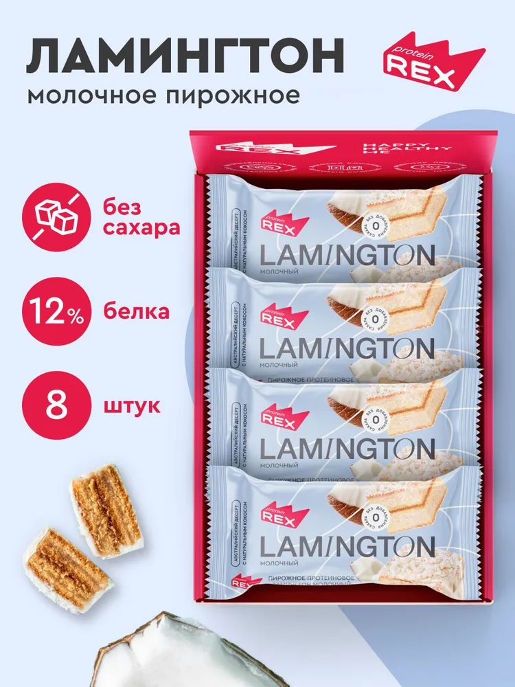 Пирожное Lamington ProteinRex — это протеиновый десерт без добавленного сахара, выполненный в австралийском стиле. Каждое пирожное состоит из двух нежных бисквитных половинок, соединенных кремовой начинкой, покрытых глазурью и обсыпанных кокосовой стружкой.