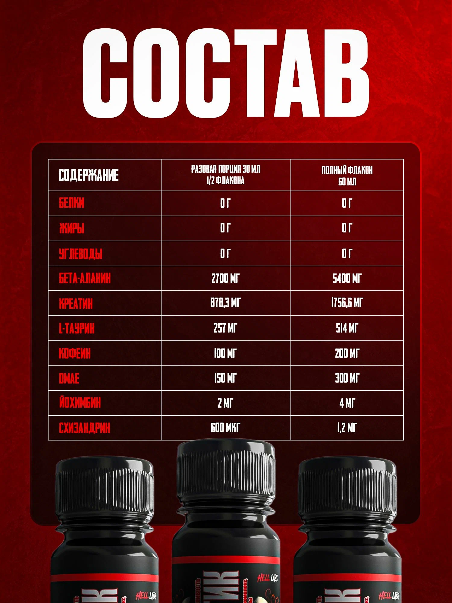Hell Labs Psychotic Shot 60ml представляет собой мощный предтренировочный комплекс, созданный для тех, кто стремится к максимальной интенсивности и результативности своих тренировок. В его состав входят активные компоненты, такие как кофеин, йохимбин, креатин моногидрат, бета-аланин, L-таурин, DMAE, схизандрин и другие.