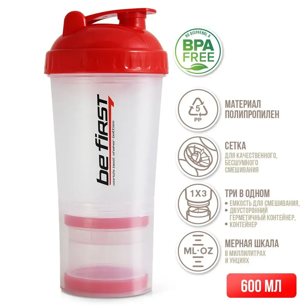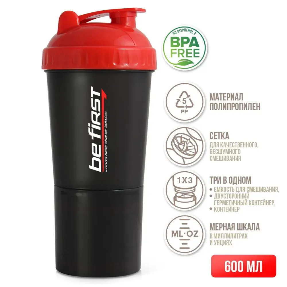 Шейкер Be First — бутылка для смешивания спортивного питания с динамичным дизайном и оптимальным объемом. Модель 600 мл создана для идеального приготовления протеиновых коктейлей, гейнеров и витаминных напитков.