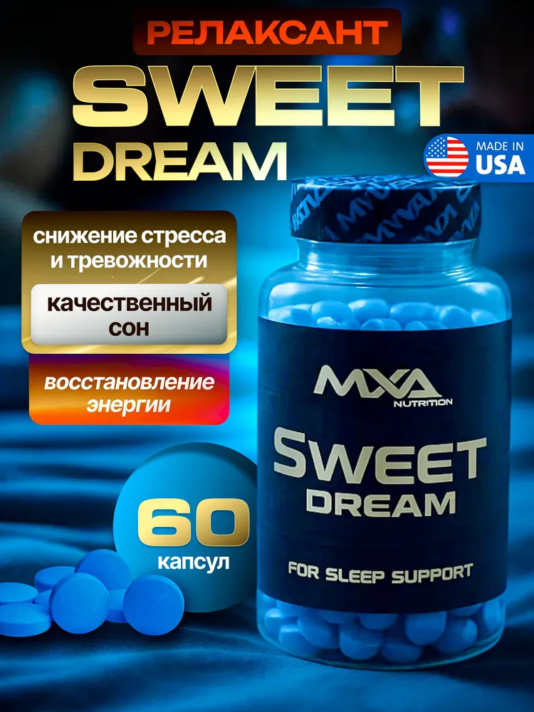 Sweet Dream MXA Nutrition — это натуральный комплекс для здорового сна и глубокого расслабления, созданный на основе мелатонина, магния и экстрактов успокаивающих растений. Формула разработана для мягкой регуляции циркадных ритмов, облегчения засыпания и улучшения качества ночного отдыха без эффекта привыкания.