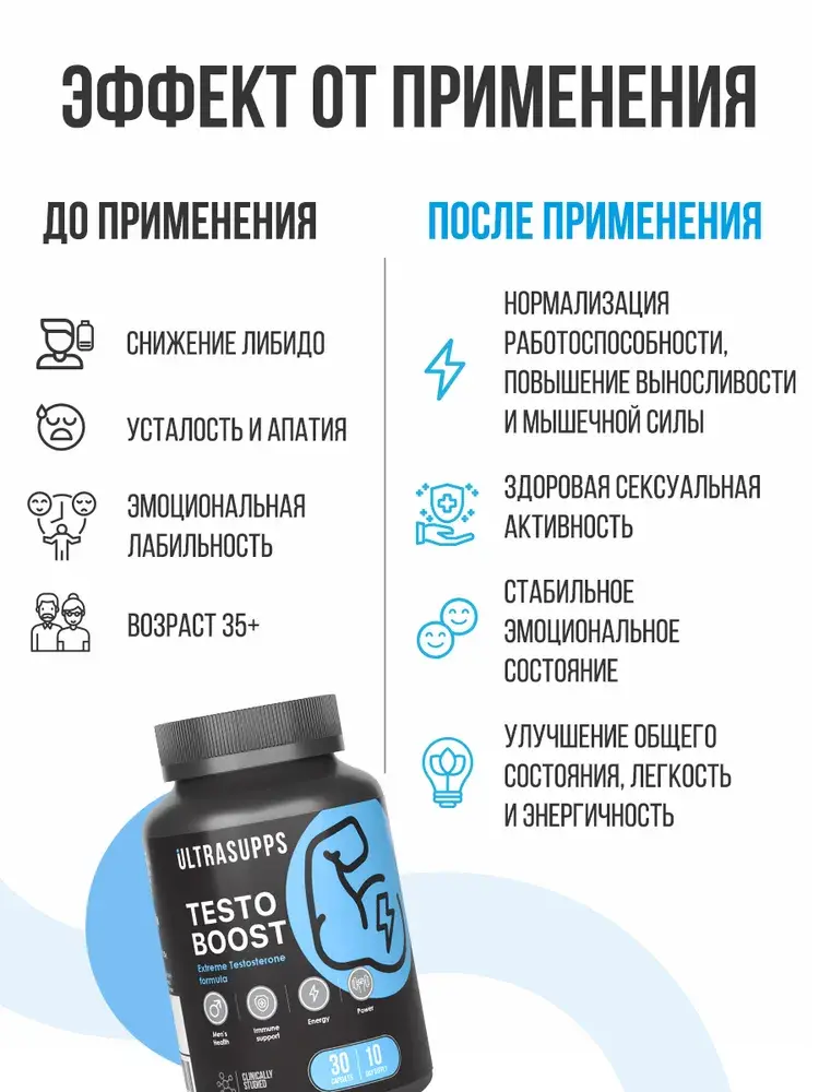 TestoBoost от UltraSupps — это натуральный комплекс для поддержки уровня тестостерона, увеличения силы, выносливости и общей физической активности. Продукт разработан для мужчин, которые хотят улучшить спортивные показатели, повысить тонус и сохранить здоровье гормональной системы.
