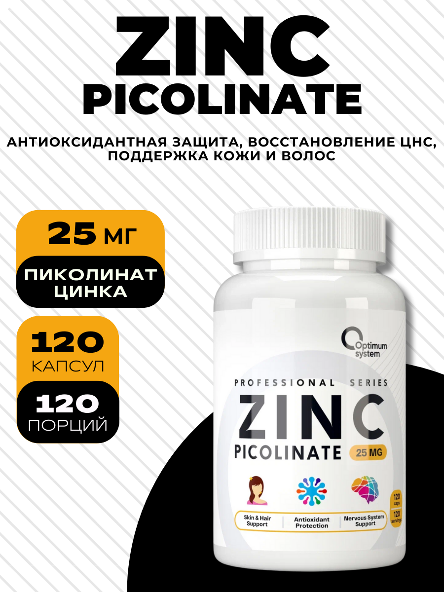 Zinc Picolinate Optimum System — это высокобиодоступная пищевая добавка цинка в легкоусвояемой форме пиколината. Каждая капсула содержит 25 мг чистого элементарного цинка, что покрывает 167% от рекомендуемой суточной нормы потребления. Препарат предназначен для укрепления иммунной системы, улучшения состояния кожи, волос и ногтей, а также поддержки репродуктивного здоровья и гормонального фона.